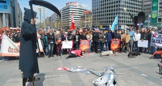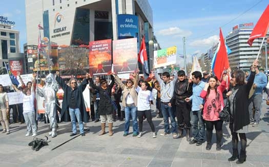 BaÅŸkent Dayanışması bileÅŸenleri Tiyatro grupları ile beraber MenekÅŸe Sokak’tan Güvenpark’a yürüdü. Sloganlar eÅŸliÄŸinde yürüyen grup, “Her yer sanat her yer direniÅŸ” “Tüsak’a hayır yaÅŸasın sanat” dedi. BaÅŸkent Dayanışması yürüyüşün ardından, 27 Mart Dünya Tiyatrolar günü nedeniyle Güvenpark’ta kentlilere tiyatro şöleni yaÅŸattı. BaÅŸkent Dayanışması tiyatro topluluÄŸu Güvenpark’ta “Alo babacım AOÇ’de ne yapıyoruz?” oyununu sergiledi. BaÅŸkent Dayanışması adına basın açıklaması okundu. Açıklamayı Ali YavÅŸanlı okudu. Yapılan açıklamada, “Daha dün yeni Sahne’yi hamburgerci yapan eller, Åžimdi de Macunköy’de İrfan ÅžahinbaÅŸ sahnesinin topraklarına göz dikmiÅŸ durumdalar. AOÇ’nin baÄŸrına hançer saplayarak, BaÅŸbakanlık sarayı yapmaya kalktılar. Rant uÄŸruna AOÇ’ye , sit alanlarına, sanat kurumlarına saldırmaktalar. Ülkemizde iktidara sahip olanlar güzel olan her ÅŸeyi yok etmeye çalışıyorlar. Bizler sanatçılar her koÅŸulda sanatımızı yapacağız. Sanat eleÅŸtirendir, sanat birleÅŸtirendir. Çünkü sanat aydınlanmadır. Sanat baÅŸkaldırıdır. “ifadelerine yer verildi. Mimarlar Odası Ankara Åžube BaÅŸkanı Tezcan KarakuÅŸ Candan söz alarak AOÇ’deki talanı anlattı. Candan, “sanat özgürlüktür soluÄŸumuz, nefesimiz ve sesimizdir” dedi. Candan 29 Mart’ta AOÇ’de BaÅŸkent Dayanışması’nın yapacağı büyük mühürleme eylemine kentlileri davet etti. Katılım için MeÅŸrutiyet Caddesi’nden saat:12.30’da otobüs kaldırılacağını duyurdu. basın açıklamasından sonra Yüksel Caddesi’ne yürüyen grup üyeleri üzerinde “diren AOÇ” , “ TÜSAKLASAK da mı ? Saklasak,TÜSAKLAMASAK da mı Saklasak ?” ,Sokak lambayla deÄŸil , Sanatla aydınlanır” yazılı dövizler taşıyan grup, “Sanat için , demokrasi için, AOÇ için oy ver” çaÄŸrısı yaptı. “Yüksel’de pandomim gösterisi yapan BaÅŸkent Dayanışması tiyatro topluluÄŸu, sanatın insanı özgürleÅŸtirdiÄŸi mesajını verdi.