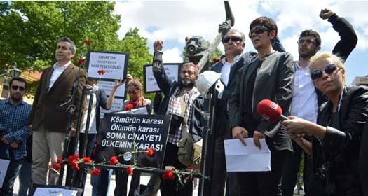 “Kaza değil cinayet” Başkent Dayanışması’nın çağrısıyla bir araya gelen sivil toplum örgütleri Soma’daki ölümleri protesto etti. Olgunlar Sokak’ta bulunan Madenciler anıtına karanfiller ve kömür bırakan Başkent Dayanışması bileşenleri ardından Güvenpark’a yürüdü.