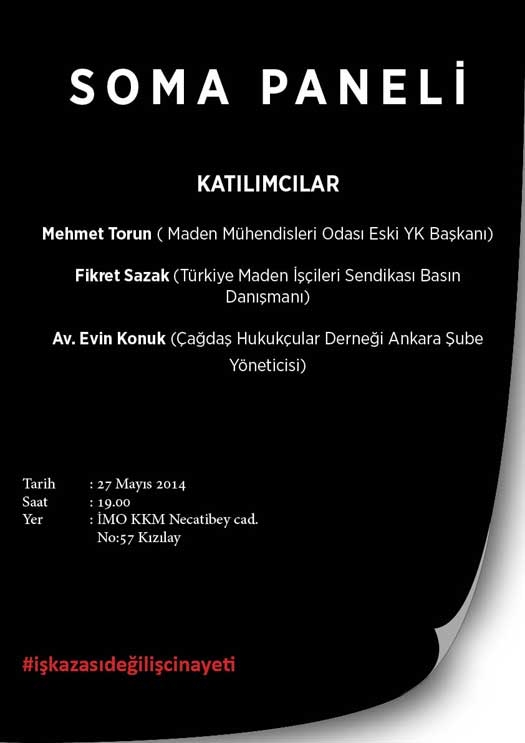 TMMOB Ankara il Koordinasyon Kurulu (İKK)nun gerçekleştireceği SOMA Paneli bugün yapılıyor. Panelde konuşmacı olarak, TMMOB Maden Mühendisleri Odası Eski YK Başkanı Mehmet Torun, Türkiye Maden işçileri Sendikası Basın Danışmanı Fikret Sazak, Çağdaş Hukukçular Derneği Ankara Şube Yöneticisi Avukat Evin Konuk yer alıyor. Soma’da meydana gelen 301 kişinin hayatını kaybetmesine neden olan iş cinayetinin tartışılacağı panel bugün saat 19.00’da İnşaat Mühendisleri Odası’nda gerçekleştirilecek.