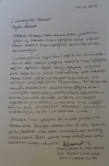 Anıtkabir defterini imzalayan Candan, mücadeleyi sürdüreceklerine de notlar arasında yer verdi. Mimarlar Odası Ankara Åžubesi adına Mimarlar Odası Ankara Åžube BaÅŸkanı Tezcan KarakuÅŸ Candan, deftere “Cumhuriyet’in Kurucusu, Büyük Atatürk” ÅŸeklinde baÅŸlayan ÅŸu ifadelerle not aldı: “TMMOB Mimarlar Odası Ankara Åžubesi yöneticileri, üyeleri ve Atatürk Orman ÇiftliÄŸine sahip çıkanlar olarak , Atatürk Orman ÇiftliÄŸinin 90.kuruluÅŸ yılında, huzurunuzdayız. Cumhuriyetimizin özgürlükçü deÄŸerlerinin kurucu mekanı olan ve bize emanet ettiÄŸiniz Atatürk Orman ÇiftliÄŸi'nin baÄŸrına saplanan Kaçak Saray, Ankapark vasiyetiniz,ÅŸartlı bağışınız ve hukuk ihlal edilerek asrın haksızlığı olarak inÅŸaa edildi. Cumhuriyet kazanımlarının yok edilmeye çalışıldığı günler Türkiye'sinde,İller Bankası'ndan, SaraçoÄŸlu Mahallesi'nden, Atatürk Orman ÇiftliÄŸi'ne kadar Cumhuriyetin mimari mirasını, kültürel mirasını, doÄŸal mirasını koruma inancımızla, buradaki varlığımız; Cumhuriyet deÄŸerlerinin yok edilmesi ve Atatürk Orman ÇiftliÄŸi talanına karşı yürüttüğümüz mücadelenin kararlılığının ve sürekliliÄŸinin tarihe not düşülmesi içindir. Atatürk Orman ÇiftliÄŸi'nin 90.kuruluÅŸ yılında, sizin huzurunuzda Türkiye'ye sözümüz olsun ki, Atatürk Orman ÇiftliÄŸi talanında baÅŸta yöneticiler olmak üzere sorumluluÄŸu olan herkesin evrensel hukuk ilkeleri ışığında hesap vereceÄŸi güne kadar mücadelemiz devam edecektir.” Ata’nın huzurunda mücadele sözü