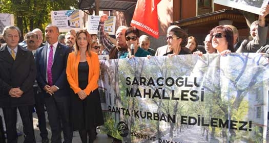 “Saraçoğlu ranta kurban edilmesin” Başkent Dayanışması bileşenleri, Saraçoğlu Mahallesi’ne yürüyüş gerçekleştirdi. Başkent Dayanışması bileşenleri, Saraçoğlu Mahallesi’nde günlerdir süren zorla tahliyeleri protesto etti. Konur Sokak’ta buluşan bileşenler Saraçoğlu Mahallesi’ne yürüyüş gerçekleştirdi. “Saraçoğlu Ranta Kurban edilemez” pankartı taşıyan grup üyeleri “Saraçoğlu korunsun AKP yıkılsın” sloganları attı. Mahalle’de basın açıklaması yapan Başkent Dayanışması bileşenlerinden İlk sözü, Mimarlar Odası Ankara Şube Başkanı Tezcan Karakuş Candan aldı. Candan, “Sabahın erken saatlerinde, insanlar işlerine çocuklar okullarına gideceği saatte Saraçoğlu Mahallesi’nde zorla tahliye yapmak için insanlar uykudayken evlerinin kapıları kırılıyor. Bu zorla tahliyeler 1. Derece sit alanında kültürel ve tarihi mirasımızda ve başkentin göbeğinde gerçekleştiriliyor. Başkentin kalbi olan Saraçoğlu Mahallesi’nin ranta kurban edilmesine izin vermeyeceğiz. Konut dokunulmazlığını ihlal eden, Kaymakamlık yetkilileri Dilek Taşpınar, Alaaddin Zararsız, Defterdarlık ve Koruma Kurulu yetkilileri hakkında gerekli suç duyurularını yaptık. Saraçoğlu Mahallesi’nin ranta kurban edilmesine izin vermeyeceğiz” dedi.
