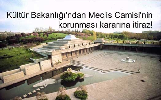 Kültür Bakanlığı Meclis Camisinin korunmasına itiraz etti Mimarlar Odası Ankara Åžubesi Meclis Camisinin korunması için dava açarken ,camii korunsun diyen yargı kararına Kültür Bakanlığı itiraz etti. Mimarlar Odası Ankara Åžubesi, TBMM 'de Behruz Çinici'nin tasarımı olan Meclis Camisi'nin korunması gerektiÄŸini, camiinin kendine özgü bir yapısı olduÄŸunu söyleyerek Koruma Kurulunun Camiyi tescil etmesini istemiÅŸti. Koruma Kurulu’nun tescil etmemesi üzerine ise Koruma Kurulu kararına dava açmıştı. Ankara 15. İdare Mahkemesi Koruma Kurulu’nun camiyi tescil etmeyen kararının yürütmesini durdurmuÅŸtu. Koruma kurulu Mahkemenin verdiÄŸi yürütmeyi durdurma sürecinde Caminin korunması için tescil etme kararı aldı. Ancak Caminin korunmasına iliÅŸkin mahkeme kararına itiraz Kültür Bakanlığı’ndan geldi. Kültür Bakanlığı Mimarlar Odası Ankara Åžubesi’nin açtığı davada kararın iptalini isteyerek itiraz etti.Kültür Bakanlığı’nın itirazı Ankara Bölge İdare Mahkemesi’nce reddedildi.