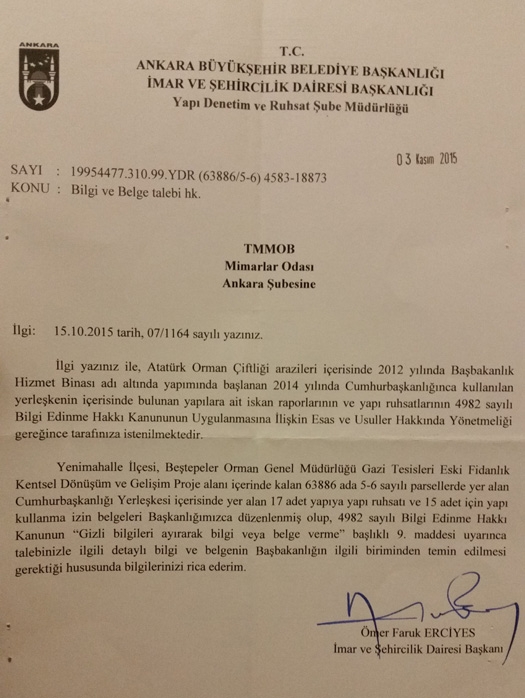 Mimarlar Odası Ankara Şubesi Kaçak Saray’ın ruhsatlarını sordu. Büyükşehir Belediyesinden “Gizli Belge” cevabı verdi. Mimarlar Odası Ankara Şubesi Atatürk Orman Çiftliği’nde 2012 yılında Başbakanlık Hizmet Binası olarak yapımına başlanan Cumhurbaşkanlığı’na devredilen alana ilişkin 17 yapı ruhsatı ve 15 iskan ruhsatını Büyükşehir Belediyesi’nden istedi. Büyükşehir Belediyesi ruhsatları “gizli belge” diyerek vermedi. Mimarlar Odası Ankara Şube Başkanı Tezcan Karakuş Candan " Kaçak Sarayın ilave yapı ruhsatlarını dava yoluyla alacağız" dedi. Bilgi Edinme Hakkı Kanunu’nun uygulanmasına ilişkin yönetmelikleri dayanak göstererek Büyükşehir Belediyesi’nden yapı ruhsatlarını resmi yazı ile istedik diyen Candan "Bilgi Edinme Kanunu’nu ihlal ederek ruhsatları bize vermiyorlar. Sistem tıkanmış durumda, Kaçak Saray için yapılan 17 ilave yapının ruhsatlarını vermekten neden çekiniyorlar. Büyükşehir Belediyesi, ruhsat gizli belge kapsamında biz veremeyiz, Başbakanlıktan isteyin diye cevap yazıyor. Söze gelince Saray milletin diyorlar, nerede ruhsat diyoruz? Ruhsatlar gizli, maliyeti açıklanamıyor."şeklinde konuştu. "Kaçak Saray'a 63.Dava" Candan "AOÇ arazilerinde yapılan hiç bir şey gizli kalamaz, ruhsatları almak için dava açıyoruz. AOÇ ve Kaçak Saray mücadelesinde 63.davamız olacak. Atatürk Orman Çiftliği mücadelemizde 63. davamız, 77 yıl önce bugün yitirdiğimiz Türkiye Cumhuriyeti’nin kurucusu Atatürk’ün ölüm yıldönümünde açılıyor. Büyük devrimci Atatürk'ün açtığı yolda, AOÇ mücadelemizi sürdürüyoruz.” İfadelerini kullandı.