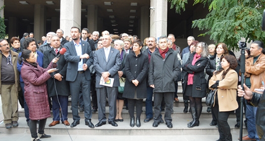 "Melih Gökçek ve avanelerinin bunu neden yaptığını iyi biliyoruz" Mimarlar Odası Genel BaÅŸkanı Eyüp Muhçu, “ Melih Gökçek’in demokrasiyi ve hukuku yok sayması ve yargıyı meÅŸgul etmesi nedeniyle buradayız. Melih Gökçek bu hakaret iddiasına kendisi de inanmamaktadır. Melih Gökçek ve avanelerinin bunu neden yaptığını iyi biliyoruz. Ankara 20 yıldır yaÄŸmalanmaktadır, kent kimliÄŸi ve Cumhuriyetin mimari mirası yok edilmiÅŸtir. Toplum katılımına kapalı bu sürecin sürdürülmesi, meslek odamızın asli görevleri içerisindedir. Bu talan yaÄŸma önünde oda faaliyetleri belli ki engel oluÅŸturmaktadır. Mahkemeler yoluyla veya ÅŸiddet yoluyla süren bu baskıların bilsinler ki hiçbir sürdürülebilirliÄŸi yok. Mimarlar Odası ve baÄŸlı ÅŸubelerimizle kent lerin yaÄŸmalanmasına karşı mücadeleye devam edeceÄŸiz” dedi. "Hukuken bir hakaret yok" CHP Milletvekili Åženal Saruhan: “ İfade özgürlüklerimizin önüne çıkan engeller bu yargılamalarla sürdürülmeye çalışılıyor, Ankara’nın kent dokusunu sürdürmek için verilen mesleki mücadele ne yazık ki yargı engeliyle karşı karşıya kalıyor. Milletvekilleri olarak bu tür haksızlıkların karşısında olacağız.Hukuken bir hakaret yok.” "Hukuk gaspı yaÅŸanıyor" CHP Milletvekili Ali Haydar Hakverdi: “ Mimarlar Odası Ankara Åžube BaÅŸkanımıza neden dava açılıyor, iki kiÅŸi arasındaki isnada iÅŸaret ettiÄŸi için yargılanıyor. Bülent Arınç ve Melih Gökçek birbirlerine karşı çok ağır isnatlarda bulundu. Tezcan Hanım o isnada iÅŸarette bulunduÄŸu için yargılanıyor. Adil bir hukuk devletinde şöyle isterdik, Melih Gökçek ve Bülent Arınç yargılansın kim haklı kim haksız hukuk önünde görmek isterdik. Bu isnatları teÅŸhir eden Mimarlar Odası Ankara Åžube BaÅŸkanı bugün hukukun gaspı ile yargılanıyor bu gerçeÄŸi görmek gerekir.” "İddianame iade edilmeliydi" CHP Milletvekili Mahmut Tanal “Anayasa ve Ceza Muhakeme kanununa 175.Maddesine göre suçun iÅŸlendiÄŸi tarih ve suçun da iddianamede açık yazılı olması gerekir derken, Sayın mahkeme bugünkü tutanağında suçun iÅŸlendiÄŸi tarihi Cumhuriyet savcısına tekrar soruyor. EÄŸer İddianamede suçun iÅŸlendiÄŸi tarih yoksa iddianamenin geri iade edilmesi gerekirken, bunu tekrar sorulması suç teÅŸkil etmekte.” "Mimarlar Odası dava yoldaşımız" Ankara Tabip Odası Genel Sekreteri Ebru Basa "Ankara'da verilen kent mücadelesinin yılmaz savunucuları Mimarlar Odası Ankara Åžubesi bizim dava yoldaşımızdır, büyüdüğümüz, anılarımız biriktirdiÄŸimiz yaÅŸam alanlarımız için verdikleri mücadele takdire ÅŸayandır, her zaman yanlarındayız" dedi.