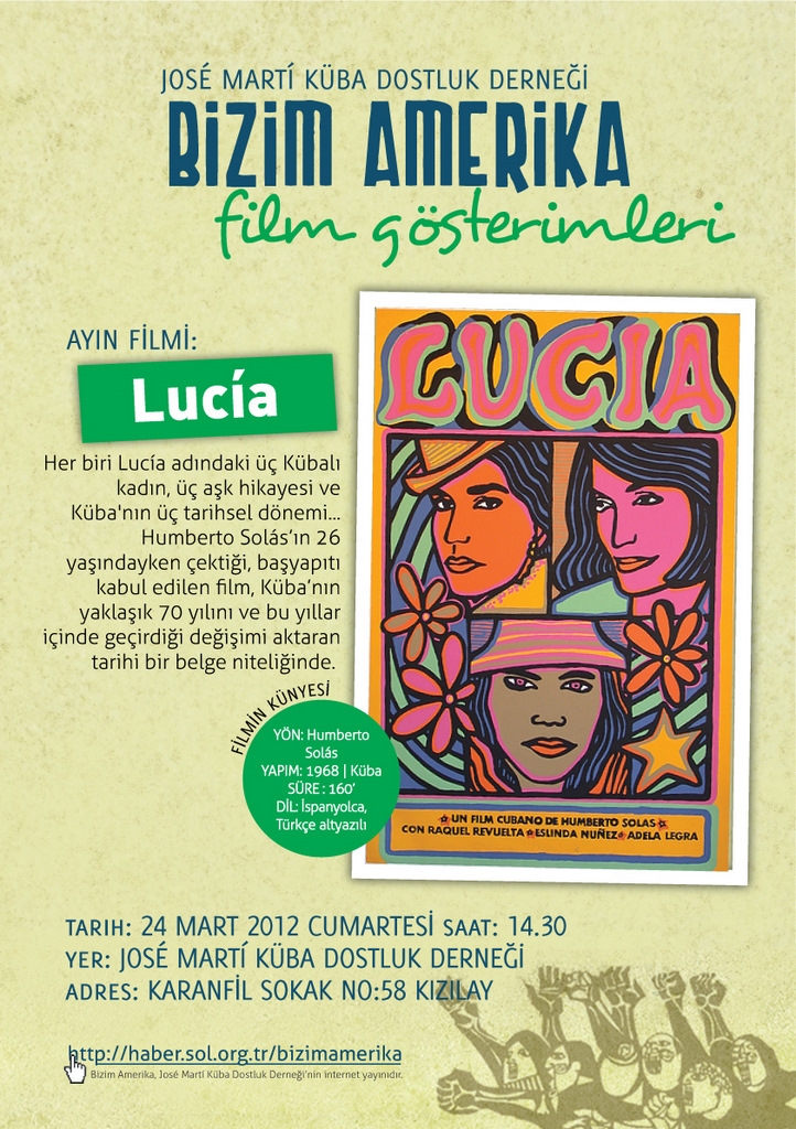 Bizim Amerika Film Gösterimleri Bizim Amerika Film Gösterimleri kapsamında bu ay Humberto Solás'ın yönettiği Lucia adlı filmi izliyoruz. 24 Mart Cumartesi günü saat 14.30da yapılacak gösterime tüm Küba Dostları davetlidir. Film hakkında kısaca: Lucia, antolojik bir filmdir. Ortak teması kadının devrime katılımı olan üç farklı hikayeden oluşmaktadır. Adı Lucia olan üç kadının öyküsü anlatılır. Birinci karakter 1895 yılında Küba’nın İspanyol sömürgesinden kurtuluş mücadelesi sürecinde gözükmektedir. İkinci karakter 1933 yılında diktatör Gerardo Machado’ya karşı Küba halk direnişinin sonuçsuz kaldığı bir dönemde yaşamaktadır. Üçüncü Lucia 1960’lı yıllarda sosyalist devrimin zaferi ile sonuçlanan bir dönemde bulunmaktadır. Üç Lucia da farklı sınıfların insanlarıdır. İlk Lucia elit, ikinci Lucia orta sınıf ve üçüncü Lucia işçi sınıfından bireylerdir. Her öykü bir aşk draması üzerine kurgulanmıştır. Yönetmen: Humberto Solás Ülke: Küba Dil: İspanyolca Altyazı: Türkçe Süre: 160’ Toplam Görüntülenme : 49353 |