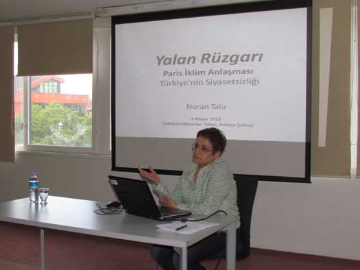 “İklimi değil, sistemi değiştir” Mimarlar Odası Ankara Şubesi Kent İzleme Merkezi tarafından gerçekleştirilen sunumlar devam ediyor. 22 Nisan tarihinde Türkiye Tarafından imzalanan Paris İklim Antlaşması'nı masaya yatıran Mimarlar Odası Ankara Şubesi " Yalan Rüzgârı: Paris İklim Anlaşması ve Türkiye'nin Siyasetsizliği " konulu sunum düzenlendi. “KİM iklim antlaşmasının yakın takip ediyor” Çevre ve Siyaset Bilimi Uzmanı Dr. Nuran Talu tarafından yapılan sunumun açılış konuşmasına Mimarlar Odası Ankara Şube Başkanı Tezcan Karakuş Candan “ Biryanda Hidroeleketirk santrallaeri nükleer santralleri gündeme getiren bir hükümetin bakanının imzayı attıktan hemen sonra açılışlarda boy göstermesi, imzanın arkasında durmayacakları anlamına gelmektedir.Nuran Talu hocamızla birlikte, Yalan rüzgarlarıyla dolu, Paris İklim antlaşması, şirketler ve ülkeler arasında ilişkiyi masaya yatırararak Kent İzleme Merkezi olarak süreci yakından takip edeceğiz “dedi.