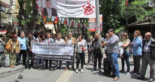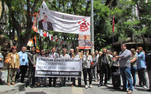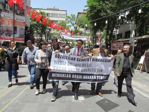 Mimarlar Odası Ankara Åžubesi, Mimarlar Odası İstanbul Åžubesi’nin Yıldız Sarayı Dış Karakol Binası’nın Gezi DireniÅŸi’nin yıldönümünde zorla tahliyelerle boÅŸaltılmasına karşı direnen Mimarlar Odası Genel BaÅŸkanı ve yöneticilerinin gözaltına alınmasını protesto etti. Yüksel Caddesi'ndeki İnsan Hakları Anıtı önünde toplanan mimarlar, “Gözaltılar serbest bırakılsın. Yıldız Saray’ı deÄŸil, Kaçak Saray boÅŸaltılsın” diyerek slogan attı. Çok sayıda STK’nın ve CHP Bursa Milletvekili Orhan Sarıbal’ın destek verdiÄŸi eylemde açıklama yapan Mimarlar Odası Ankara Åžube BaÅŸkanı Tezcan KarakuÅŸ Candan, Mimarlar Odası yöneticileri serbest bırakılana kadar odada nöbet tutacaklarını belirtti. İNTİKAM GÖSTERGESİ Candan, “ Gezi DireniÅŸi’nin üçüncü yıldönümünde dün akÅŸam 17:50'de tebligat yapıp bugün saat 10:00’da Yıldız Sarayı’nı terk edin demek intikam göstergesidir. Göz altıların serbest bırakılmasını istiyoruz. Yıldız Sarayı 49 yıllığına Mimarlar odasına tahsis edilmiÅŸtir. Bununla ilgili yürüyen hukuksal süreçler bizim lehimize sonuçlanmıştır. Hukuksal mücadele devam etmektedir. Burada bir hukuksuzluk varsa bu hukuksuzluk bu ülkenin başında bulunanlardır. AOÇ'de mahkeme kararlarına raÄŸmen Kaçak Saray'da oturanlardır. Yıldız Sarayı deÄŸil, asıl Kaçak Saray'ın boÅŸaltılması gerekmektedir. Bu hukuksuzluÄŸu yapan herkesi kınıyoruz” dedi.