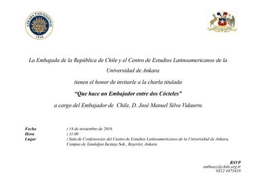 Ankara Üniversitesi Latin Amerika Çalışmaları Uygulama Merkezi (LAMER) VE Şili Cumhuriyeti Büyükelçiliği, 14 Kasım 2016 tarihinde saat 11:00’de LAMER’de “Bir Büyükelçi İki Kokteyl Arasında Ne Yapar?” söyleşisi gerçekleştirecek.