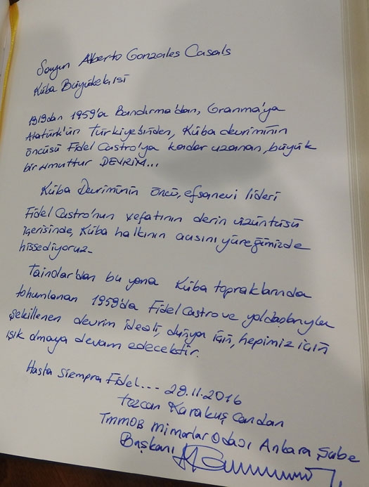 Mimarlar Odası Ankara Åžubesi, Küba’nın efsanevi lideri Fidel Castro'nun hayatını kaybetmesi sonrası Küba Cumhuriyeti BüyükelçiliÄŸi'ne taziye ziyaretinde bulundu Mimarlar Odası Ankara Åžube BaÅŸkanı Tezcan KarakuÅŸ Candan, Küba Devriminin lideri Fidel Castro’nun hayatını kaybetmesi nedeniyle Küba’nın Ankara BüyükelçiliÄŸi’ni ziyaret etti. Büyükelçi Alberto Gonzalez Casals'a taziyelerini ileten Candan, büyükelçilikte açılan taziye defterine ÅŸunları yazdı: “Sayın Alberto Gonzales Casals Küba Büyükelçisi. 1919’dan 1959’a Bandırma’dan Granma’ya Atatürk’ün Türkiyesi’nden Küba Devrimi’nin öncüsü Fidel Castro’ya kadar uzanan büyük bir umuttur DEVRİM… Küba Devrimi’nin öncü, efsanevi lideri Fidel Castro’nun vefatının derin üzüntüsü içerisinde Küba halkının acısını yüreÄŸimizde hissediyoruz. Tainolar’dan bu yana Küba topraklarında tohumlanan 1959’da Fidel Castro ve yoldaÅŸlarıyla ÅŸekillenen devrim ideali dünya için, hepimiz için ışık olmaya devam edecektir. Hasta Siempra Fidel…” Öte yandan 9 Aralık’ta Küba BüyükelçiliÄŸi’nin katılımıyla Mimarlar Odası Sergi Salonu’nda Fidel Castro anısına fotoÄŸraf sergisi açılacak. ![]() ![]() ![]() ![]() ![]() Toplam Görüntülenme : 76168 |