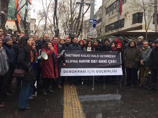 Anayasa değişikliği değil, bir rejim değişikliğidir “Egemenlik, kayıtsız, şartsız ve koşulsuz ulusundur, kişiye devredilemez. Yaşasın Laik –demokratik Türkiye Cumhuriyeti” denilen bildiride, şu ifadelere yer verildi: “Hükümdar istemiyoruz. Anayasalar, toplumsal uzlaşma metinleridir. Bir anayasanın tümüyle yeniden yapılması da bazı maddelerinin değiştirilmesi de toplumun tüm kesimlerinin ortak akıl ve kabulünü gerektirir. Bu gerçek, yalnızca darbe anayasalarının yazılmasında yok sayılır. Bir darbe ürünü olan 1982 Anayasası'nın da bugüne dek pek çok maddesi değiştirilmiştir. Ancak şimdi yapılmak istenen, demokratikleşme için Anayasa değişikliği değil, bir rejim değişikliğidir. 15 yıldır iktidarda olan partinin fiili genel başkanına, ülkeyi ve insanlarımızın hak ve özgürlüklerini teslim etme girişimidir. Bu girişimi kabul etmiyoruz. Çünkü öngörülen, Cumhurbaşkanı'nın yetkilerini genişletmek ya da başkanlık sistemi getirmek de değildir. Getirilmek istenen sistemin adının ‘cumhurbaşkanlığı' olarak anılması, bir aldatmacadan ibarettir. Yapılmak istenen, parlamenter demokratik sistemin ortadan kaldırılması girişimidir. Cumhuriyet'in kurucu değerlerine yapılan bir saldırıdır. Yetkileri tırpanlanıp tek bir adama devredilmek istenen Meclis, Kurtuluş Savaşı'nı yöneten; Mustafa Kemal Atatürk'ün önderliğinde Büyük Zafer'i kazanan; egemenliği kayıtsız, şartsız millete devreden; saltanatı ve hilafeti kaldıran; Sevr'i yırtıp Lozan'ı imzalayan; Cumhuriyet'i ilan eden Gazi Meclis'tir.”