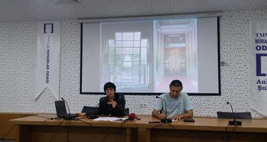 Siyaset bu camiyi yıkmak istediÄŸi için, caminin tescili kaldırıldı Camiyi tescil etmeyen Koruma Kurulu’na dava açtıklarını da anımsatan Candan, şöyle devam etti: “Koruma kurulu tescil etmedi koruma kuruluna dava açıldı. Mahkeme kararıyla cami tescil edildi. Çünkü baÅŸka bir örneÄŸi yok. Bizim kültür varlıklarımızı korumakla yükümlü olan Kültür Bakanlığı caminin tescil edilmesine izin veren mahkeme kararına itiraz ediyor. Yeni dönemde yeni hikaye dedikleri böyle bir dönem. Bilim, estetiÄŸi ve sanatı devre dışı bırakan bir hikaye yazmaya çalışıyorlar.Üst mahkeme İtirazlarını kabul etti. Siyaset bu camiyi yıkmak istediÄŸi için, yapının tescili kaldırıldı.Yazmak istedikleri hikayede bundan sonra adalet yok, adalet hiçbirimiz için eÅŸit bir ÅŸekilde iÅŸlemeyecek demektir. Bunu buradan okuyoruz. Bu karar bozma süreci ile birlikte caminin yıkım süreci tekrar gündeme geldi. TBMM biz kamuoyunun gündemine taşıdığımıza ‘Hayır biz o camiyi yıkmayacağız’ diyor. Fakat biz biliyoruz ki, caminin yıkım kararı verildi. Elinde kepçeyle hareket edenler ve gücü olanlar bu camiyi yıkacaklar, yeni hikaye kepçe ve güç hikayesi olarak yazılmak isteniyor. Bunu da reddediyoruz. .TBMM cami müelifinin deyiÅŸiyle, modern bakış açısının 1400 yıl önceki ilk camiden esinlenerek ortaya koyulmuÅŸ modern bir bakış açısının ürünüdür. Yeni hikaye modernizme karşı yazılan bir hikayedir.” Türkiye’de bir örneÄŸi daha yok Candan, camideki ışık oyunlarına ve kullanılan malzemeye ve içindeki detaylara da arkasındaki bahçeye dikkat çekerek, “ Bu cami yaÅŸarken cenneti göstermiÅŸ, aslında siz yaÅŸarken doÄŸruluk ve dürüstlük içinde davrandığınızda, nereye ait olduÄŸunu nerede olacağınızı gösteren bir bakış açısıyla inÅŸa edilmiÅŸ. Rant yok bunun arkasında. Siz doÄŸru ve dürüstseniz halkınıza yalan söylemiyorsanız gideceÄŸiniz yer burası demek istemiÅŸ . Åžimdi bu cami yıkılmak isteniyor. Uzun süredir bu caminin yıkılmaması için mücadele ediyoruz. Mimarlık örgütleri ve mimarlar odası olarak caminin yıkılmaması için mücadele edeceÄŸiz” diye konuÅŸtu. Caminin vaziyet planını ve kesitlerini gösteren Candan, “Bunun bir örneÄŸi daha yok . Bu kadar estetik ve yerel ve gelenekseli iç içe geçirmiÅŸ modernize etmiÅŸ bir cami yok. Böyle bir cami daha yok” dedi. Candan, Behruz Çinici’nin cami projesi tasarımının çıkış noktasına dair söylediÄŸi, “Dünyadaki ilk cami 1400 yıl önce inÅŸa edilen Hz. Peygamberin evidir. Mekke’ye yöneltilmiÅŸ düz çatılı, uzunlamasına dörtgen sade bir mekan. Ne minare ne mihrap veya ayrılmış bir makam yeri yok. Ne de kubbe hiçbiri yok. Kutsal peygamberin saadet dolu zamanlarında bu yapılar böylesine düz basit mütevazi ve güzeldiler. İşte bu sadeliÄŸi yeni yaratılarda hareket noktasının alınmasının bizi yanlışlardan eskiyi tekrardan sadece geçmiÅŸteki bir tipolojiye baÄŸlı kalmaktan kurtaracağına ve ufkumuzu açacağına inanarak TBMM Camisi tasarımında böyle davranmaya çalıştık” sözlerini hatırlattı. Türkiye’de İslamiyet kendi özünden uzaklaÅŸmaktadır