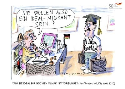 “50 yıl 50 Karikatür: Alman Karikatüristlerin Gözüyle Türkler” sergisi Almanya’daki göçmen Türklerin yaşam biçimini anlatmakta olan sergi Özellikle son dönemdeki Türkiye-AB ilişkileri 11 Eylül sonrası gelişmelere bağlı olarak yoğunlaşan yabancı düşmanlığı, öz kültür, vatandaşlık testi ve çifte vatandaşlık gibi ayrımcılık politikaları, göçmenler üzerinden yapılan siyasi tartışmalar bu karikatürlerde geniş yer bulmuş görünüyor. T.C. Başbakanlık Yurtdışı Türkler ve Akraba Topluluklar Başkanlığı, Hacettepe Üniversitesi Göç ve Siyaset Araştırmaları Merkezi (HUGO) ve Konrad-Adenauer-Stiftung‘un işbirliği ile gerçekleştirilen sergi 12 Nisan’dan 28 Nisan tarihine kadar gezilebilir.