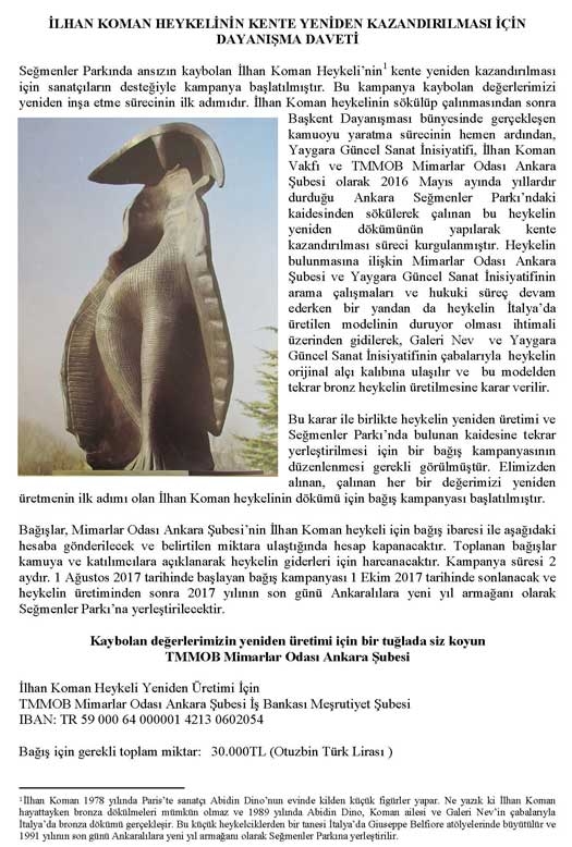 “Kaybolan deÄŸerlerimizin yeniden üretimi için bir tuÄŸlada siz koyun” Mimarlar Odası Ankara Åžubesi, Yaygara Güncel Sanat İnisiyatifinin ve Galeri Nev SeÄŸmenler Parkında ansızın kaybolan İlhan Koman Heykeli’nin kente yeniden kazandırılması için bağış kampanyası baÅŸlattı. Mimarlar Odası Ankara Åžubesi ve sanatçılar “Kaybolan deÄŸerlerimizin yeniden üretimi için bir tuÄŸlada siz koyun” çaÄŸrısı yaptı SeÄŸmenler Parkı’nda ansızın kaybolan İlhan Koman Heykeli’nin kente yeniden kazandırılması için sanatçıların desteÄŸiyle kampanya baÅŸlatıldı. Kaybolan deÄŸerlerimizi yeniden inÅŸa etme sürecinin ilk adımı olan kampanya İlhan Koman heykelinin sökülüp çalınmasından sonra BaÅŸkent Dayanışması bünyesinde gerçekleÅŸen kamuoyu yaratma sürecinin hemen ardından hayata geçirildi. Yaygara Güncel Sanat İnisiyatifi, İlhan Koman Vakfı ve TMMOB Mimarlar Odası Ankara Åžubesi 2016 Mayıs ayında yıllardır durduÄŸu Ankara SeÄŸmenler Parkı’ndaki kaidesinden sökülerek çalınan bu heykelin yeniden dökümünün yapılarak kente kazandırılması için kolları sıvadı. Heykelin bulunmasına iliÅŸkin Mimarlar Odası Ankara Åžubesi ve Yaygara Güncel Sanat İnisiyatifinin arama çalışmaları ve hukuki süreç devam ederken bir yandan da heykelin İtalya’da üretilen modelinin duruyor olması ihtimali üzerinden gidildi. Galeri Nev ve Yaygara Güncel Sanat İnisiyatifinin çabalarıyla heykelin orijinal alçı kalıbına ulaşılır ve bu modelden tekrar bronz heykelin üretilmesine karar verildi. Bu karar ile birlikte heykelin yeniden üretimi ve SeÄŸmenler Parkı’nda bulunan kaidesine tekrar yerleÅŸtirilmesi için bir bağış kampanyası baÅŸlatıldı. Bağışlar, Mimarlar Odası Ankara Åžubesi’nin İlhan Koman heykeli için bağış ibaresi ile “TMMOB Mimarlar Odası Ankara Åžubesi İş Bankası MeÅŸrutiyet Åžubesi IBAN: TR 59 000 64 000001 4213 0602054” hesabına gönderilecek. Bağış için gerekli miktarı olan 30.000 TL’ye ulaÅŸtığında hesap kapanacak. Toplanan bağışlar kamuya ve katılımcılara açıklanarak heykelin giderleri için harcanacak. Kampanya süresi 2 aydır. 1 AÄŸustos 2017 tarihinde baÅŸlayan bağış kampanyası 1 Ekim 2017 tarihinde sonlanacak ve heykelin üretiminden sonra 2017 yılının son günü Ankaralılar’a yeni yıl armaÄŸanı olarak SeÄŸmenler Parkı’na yerleÅŸtirilecek. Toplam Görüntülenme : 70370 |