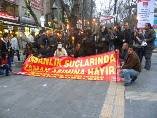 Pir Sultan Abdal Kültür Derneği Sivas katliamı davasında zaman aşımı kararı alındığından bu yana Ankara’da her Perşembe günü Yüksel caddesi’nde basın açıklaması yapıyor. Dün akşam meşaleli yürüyüşün ardından İnsan Hakları anıtı önünde gerçekleştirilen açıklamada bir kez daha “Zaman aşımına hayır” dediler ve “Eşit yurttaşlık istiyoruz” “ Diyanet işleri kaldırılsın” “zorunlu din dersleri kaldırılsın” sloganlarıyla taleplerini sıraladılar.