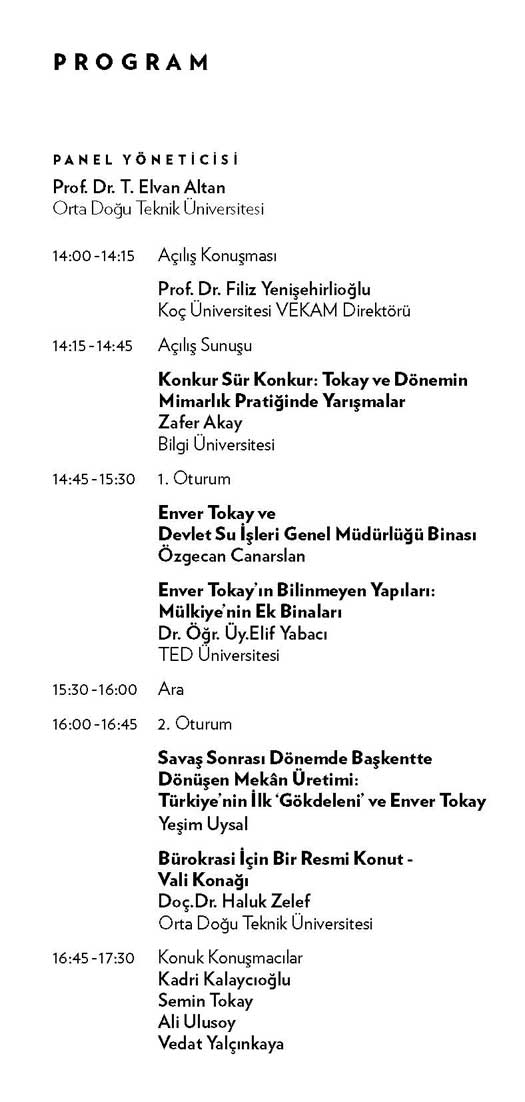 Panel ile Tokay'ın mimarlık serüvenini ortaya çıkarmak amaçlanıyor. Öte yandan bu panelle Kızılay merkezinin en önemli yapısı Emek İşhanı’nın (Gökdelen) tasarımcısı olarak tanınan, önemli pek çok kamu yapısının tasarımında gerek ekip üyesi gerekse bireysel olarak yer alan, kentte önemli izler bırakan ve mimarlık yarışmalarında pek çok ödülün sahibi olan Enver Tokay’ın yeniden mimarlık ortamının gündemine taşımanın hedefleniyor.