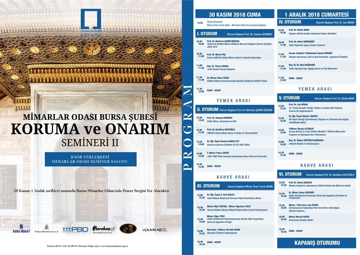 Bursa’da Koruma ve Onarım Semineri gerçekleÅŸtirilecek Mimarlar Odası Bursa Åžubesi tarafından Koruma ve Onarım Semineri II" 30 Kasım - 1 Aralık 2018 tarihlerinde Bursa BAOB YerleÅŸkesi Mimarlar Odası Seminer Salonu'nda gerçekleÅŸtirilecek. Mimarlar Odası Bursa Åžube BaÅŸkanı Ömer Faruk Åžahin’in açılış konuÅŸmasıyla 30 Kasım saat 10:00’da baÅŸlayacak etkinlik 6 oturumda düzenlenecek. BaÅŸkanlığını Prof. Dr. Zeynep Ahunbay’ın yaptığı birinci oturuma konuÅŸmacı olarak, Prof. Dr. Neriman Åžahin Güçhan, “Türkiye’de kültürel mirası etkileyen mevzuat deÄŸiÅŸimi üzerine görüşler: 2004-2018”, Prof. Dr. Murat TaÅŸ, “İznik'in UNESCO Dünya Miras Listesi'ne Hazırlık Çalışmaları”, Doç. Dr. Yonca Erkan,” Tarihi Kentsel Peyzaj Yaklaşımı”, Dr. Mimar Banu Pekol, “Kültürel Mirasın Korunmasında Kapasite GeliÅŸtirme (KORU) Projesi” sunumlarıyla katılacak. Prof. Dr. Neriman Åžahin Güçhan oturum baÅŸkanlığını yapacağı ikinci oturuma ise, Prof. Dr. Zeynep Ahunbay, “Kültür Mirası, Demokrasi ve Etik”, Prof. Dr. Neslihan DostoÄŸlu, “UNESCO Dünya Mirası Bursa: Fırsatlar ve Sorumluluklar”, Dr. Öğr. Üyesi Sermin Çakıcı Alp, “Bursa'nın Koruma Tarihinde 50 Yıl (1955-2005)”, Y. Mimar Feyza Aksoy, “1930-1960 Yılları Arasında GerçekleÅŸen Bursa Ulucami Onarımları” sunumlarıyla katkı sunacak. 3. oturumun baÅŸkanlığın ise mimar Ömer Faruk Faruk Åžahin üstleniyor. Oturuma konuÅŸmacı olarak Dr. Öğr. Üyesi A. Esin Kuleli, “YeÅŸil Külliyesi Medresesi Koruma Projesi Hazırlanma Süreci”, Mimar Ufuk ToktaÅŸ / Mimar OÄŸuzhan Telci, “Sancak Bölgesi Sjenica Vilayeti Valide Sultan Camisi Restorasyonu”, Mimar OÄŸuz Yeke, “Kültür Varlıklarının Restorasyonunda Destek-Hibe Programları: Bursa'da Uygulama ÖrneÄŸi”, Rest.Uzm. Y.Mimar M.Fatih Aydın, “Muradiye Türbeleri Restorasyonu” sunumlarıyla katılacak. EtkinliÄŸin1 Aralık Cumartesi günü 4. Oturumla devam edecek. Saat 10:20’de baÅŸlayacak baÅŸkanlığını Prof. Dr. Can Binan’ın yaptığı 4. oturumda Prof. Dr. Görün Arun “Deprem Etkisini Azaltan Geleneksel Yapım Teknikleri”, Prof. Dr. Adem DoÄŸangün “Tarihi Yapılarda Taşıyıcı Sistem Tasarımı”, Orman Endüstri Y.Mühendisi Demet Sürücü “AhÅŸabın Korunması; Sivil ve Anıt Eserlerden Uygulama Örnekleri”, Doç. Dr. M. Bilal BaÄŸbancı “Tarihi Yapılarda Yapı SaÄŸlığı İzleme ve Test Yöntemleri” sunumlarıyla konuÅŸmacı olarak yer alacak. Prof. Dr. Görün Arun’un oturum baÅŸkanlığını yaptığı beÅŸinci oturuma ise konuÅŸmacı olarak Prof. Dr. Can Binan, “55. Yılında Venedik Tüzüğü; Türkiye ve Dünya'daki Tartışma Üzerine Bir DeÄŸerlendirme”, Dr. Öğr. Üyesi Gülsün Tanyeli Bir Yapım TekniÄŸi Çözümlemesi: Belgeler ve Gözlemler Aracılığıyla Seddülbahir Kalesi, Y.Mimar Burçin Altınsay Europa Nostra En Fazla Tehlike Altındaki 7 Kültürel Miras Alanı Programı ve Büyükada Rum Yetimhanesi, Doç. Dr. Özlem Köprülü BaÄŸbancı “Edremit Atatürk Evi Restorasyonu” sunumlarıyla katkı sunacak. 6. oturumun baÅŸkanlığını Prof. Dr. Neslihan DostoÄŸlu’nun yapacak. 6. Oturumda Prof. Dr. Meriç Bakiler, Merkez AraÅŸtırma Laboratuvarı: Kültür Varlıklarında Malzeme Analizi, Dr. Mimar Olcay Aydemir Kültür Varlıklarının Korunması Sürecinde Uygulama Örnekleri ve Entegrasyon, Mimar / Rest.Uzm. Aslı Özbay Restorasyonun Kapadokya Hali: Yerin Altı ve Üstü BaÅŸka Öyküler Anlatırsa, Mimar Nevzat Sayın, Korunması gereken nedir?” konularında sunumlar gerçekleÅŸtirecek. Etkinlik kapanış oturumuyla son bulacak. Etkinlik programı ekte yer almaktadır