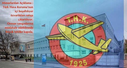 Türk Hava Kurumu’nun içi boÅŸaltılıyor öz varlıkları satışa çıkartılıyor Orman yangınlarına müdahale edebilmede büyük tehlike kapıda Cumhuriyet kurumlarından Türk Hava Kurumu, 02 Nisan 2020 tarihli Resmî Gazetede ilan edilen ve 13 Nisanda satış ihalesi duyurusu yapılan, orman yangınlarında kullanılan hava araçları ile 3 Nisan 2020 ve 05 Nisan 2020 tarihli Resmi Gazete ile duyurusu yapılan taşınmazlarını satışa çıkartıyor Mimarlar Odası Ankara Åžubesi, kayyum yönetimindeki Türk Hava Kurumu’nun, (THK) 11 uçağının ardından aralarında meskenlerin de bulunduÄŸu 7 taşınmazını daha satışa çıkarmasına tepki gösterdi. Mimarlar Odası Ankara Åžubesi, “Covid 19 pandemisinde saÄŸlık mücadelesi devam ederken yapılan bu ihale etik deÄŸildir, iptal edilmelidir. Türk Hava Kurumu mal varlıkları satılamaz” dedi.