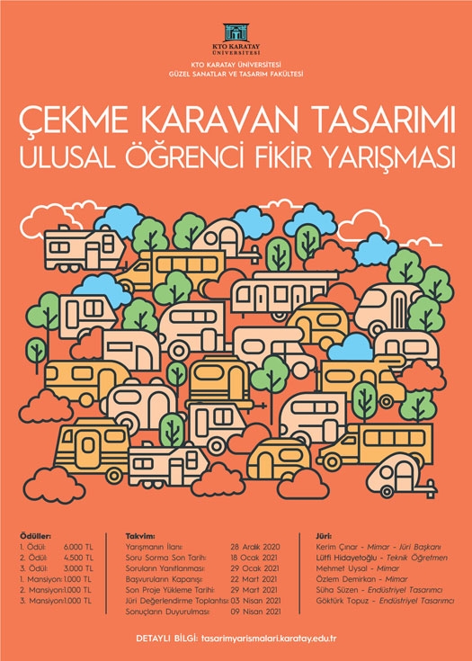 KTO Karatay Üniversitesi Güzel Sanatlar ve Tasarım Fakültesi tarafından “Çekme Karavan Tasarımı Ulusal Öğrenci Fikir Yarışması” düzenlenmektedir. Yarışmaya dair içerik ve katılım koşullarını bilgilerinize sunarız. Saygılarımızla, TMMOB Mimarlar Odası Ankara Şubesi Çekme Karavan Tasarımı Ulusal Öğrenci Fikir Yarışması hakkında: Yaşanan pandemi sürecinin getirdiği sosyal mesafe kuralları; yaşama, barınma, seyahat ve tatil mekânlarında farklı çözüm arayışları ortaya çıkarmıştır. Çekme karavanlar, motor gücüne sahip bir araç ile taşınabilmesi sayesinde geçici veya sürekli konaklama ihtiyacını karşılama potansiyele sahip mobil mekânlardır. Bu nedenle karavanlar pandemi süreci de dâhil olmak üzere her zaman tatil mekânı olarak kullanılabilecek araçlardır. Bununla beraber karavanlar doğa ile yakın temas içinde olunmasını da sağlamaktadır. Bu bağlamda KTO Karatay Üniversitesi Güzel Sanatlar ve Tasarım Fakültesi tarafından düzenlenen “Çekme Karavan Tasarımı Ulusal Öğrenci Fikir Yarışması”, mekân üretim süreçlerine alıştırmak, dâhil etmek ve teşvik etmek için mimarlık, iç mimarlık, iç mimarlık ve çevre tasarımı ve endüstriyel tasarım öğrencilerini; hafif, taşınabilir ve esnek çözümler içeren, kullanıcısının sosyal, fiziksel, psikolojik ihtiyaçlarını karşılayan ÇEKME KARAVAN tasarlamaya davet etmektedir. 22 Mart 2021 tarihine kadar başvuruların kabul edileceği yarışma hakkında ayrıntılı bilgi http://tasarimyarismalari.karatay.edu.tr/ web adresinden edinilebilmektedir. Ayrıca tüm Üniversitelere resmi yazı gönderilmiştir. Toplam Görüntülenme : 20227 |