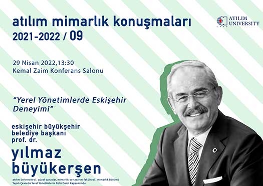 Atılım Mimarlık Konuşmaları 2021-2022/ 09 :Yerel Yönetimlerde EskişehirAtılım Üniversitesi Mimarlık Bölümü Yapılı Çevrede Yerel Yönetimlerin Rolü dersi kapsamında, Eskişehir Büyükşehir Belediye Başkanı Prof Dr. Yılmaz Büyükerşen katılımı ile Yerel Yönetimlerde Eskişehir Deneyimi üzerine düzenlenecek atılım mimarlık konuşmaları 2021-2022/ 09 etkinliği 29 Nisan 2022 Cuma günü saat:13.30’da Atılım Üniversitesi Kemal Zaim Konferans Salonunda gerçekleşecektir.