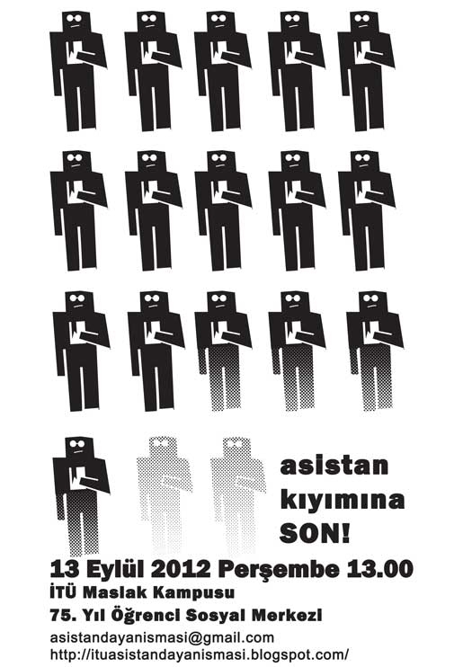 İTÜ’de protesto İstanbul teknik Üniversitesi’nde çalışan bir araÅŸtırma görevlisinin iÅŸine son verilmesi üzerine araÅŸtırma görevlileri arkadaÅŸlarının iÅŸe geri alınması çaÄŸrısı yaptı. 13 Eylül 2012 PerÅŸembe günü saat 13.00’te İTÜ Maslak Kampusu 75. Yıl Öğrenci Sosyal Merkezi’nin önünde buluÅŸarak anti-demokratik uygulamaları protesto edeceklerini ifade eden araÅŸtırma görevlileri taleplerini şöyle sıraladı: • İTÜ’de YÖK’ün dayattığı 22 Haziran 2012 tarihli görüş yazısı gerekçe gösterilerek iliÅŸiÄŸi kesilen arkadaşımızın derhal iÅŸe geri alınmasını istiyoruz.