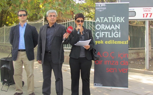 Ali Hakkan’ın konuÅŸma yaptığı sırada, demir perdeler çekilmiÅŸ olan Orman Genel Müdürlüğü arazisinden kamyonların çıktığı görüldü, Hakkan kamyonları göstererek şöyle konuÅŸtu: “ gördüğünüz gibi biz burada açıklama yaparken de hafriyat taşıyan kamyonları görüyoruz, AOÇ’de tahribat sürüyor ve BaÅŸbakanlık Hizmet Binası temeli atılmış ve kazı çalışmaları baÅŸlamış durumda. Bu nedenledir ki özel olarak AOÇ’ye ilgi çekmek istiyoruz.“ Ali Hakkan 6 Ekim’de AOÇ’de yapılacak olan pikniÄŸe, AOÇ’ye sahip çıkmak isteyen Ankaralıları davet etti. Dünya Mimarlık günü basın açıklamasını, Mimarlar Odası Ankara Åžube Yönetim Kurulu Sekreter Üyesi Tezcan KarakuÅŸ Candan, okudu. Açıklamada; “Dünyanın her yerinde mimarlar 1 Ekim Dünya Mimarlık Gününde kendi geleceklerinin mimarı olmak için “Daha İyi Kentler, Daha İyi YaÅŸamlar / Mimarlıkla DeÄŸiÅŸen Kentler” talebiyle, ses veriyorlar. Uluslararası Mimarlar BirliÄŸi’ne (UIA) baÄŸlı 117 ülkede 1.300.000 mimarın sesi, dünyanın mimarlarının daha iyi bir gelecek isteyen sesidir. Dünya Mimarlık Günü, Türkiye’de, mimarlığın, kentlerin ve yeÅŸil alanların katledildiÄŸi, yaÅŸam alanlarımızın zenginleÅŸmesine olanak saÄŸlayan kentsel mekanların yok edilmeye çalışıldığı, kentlerin özgün tarihsel kaynaklarından kopartılarak hükümet eliyle kimliksizleÅŸtirilmeye çalışıldığı bir dönemde kutlanıyor. Bu kutlama, her ÅŸeyden çok direnmedir; mesleÄŸimize, ülkemize, geleceÄŸimize ve yaÅŸamımıza sahip çıkmadır” sözlerine yer verildi. “DireniÅŸin mimarları” Candan, “Her ÅŸeyin tek elde toplandığı, hukuk devletinden giderek uzaklaşıldığı bugünler, mimarlığın yaratıcılığının tek tipleÅŸtirme ile ve özgünlüğünün sıradanlaÅŸma ile ikame edildiÄŸi, telif haklarının budanmaya ve meslek odalarının sesinin kısılmaya çalışıldığı bugünler, aslında, mimarlığın yaratıcı gücüne en çok ihtiyaç duyulan günlerdir” dedi. Ayrıca Açıklamada; “BaÅŸkentte yaÅŸamak bir zenginliktir;