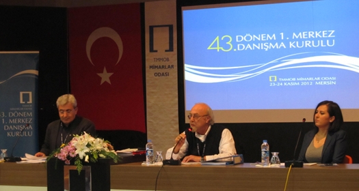 Mersin’de düzenlenen, TMMOB Kanunu’nun masaya yatırıldığı kurula MYK tarafından davet edilen üyeler ve 26 ÅŸube yöneticisi katıldı. Üye Danışma kurulunun yüksek tempolu programı, Kanun Hükmündeki Kararnameler Süreci, Oda Örgütlenme Çalışmaları, Haksız Rekabet, Mali İşler Yönetmelik Taslağı ve Türkiye Mimarlık Politikası baÅŸlıklarını kapsamaktaydı. Ancak ağırlıklı olarak, Yapı Denetimi Hakkında Kanun Tasarısı adı altında gündeme gelen, içeriÄŸi ile İmar, Belediye Gelirleri, Kat Mülkiyeti, Kıyı, İskân, Mera, Kamu Kurum ve KuruluÅŸlarının ÜrettiÄŸi Mal ve Hizmet Tarifeleri, Fikir ve Sanat Eserleri Kanunları ve 6235 Sayılı TMMOB Kanununda yaptığı deÄŸiÅŸiklikler sonucu bir torba yasa niteliÄŸi taşıyan kanun üzerinde tartışmalar yoÄŸunlaÅŸtı. Genel Sekreter Necip MUTLU’nun açılış konuÅŸması ve Merkez Yönetim Kurulu BaÅŸkanı Eyüp MUHCU’nun mesajının okunmasının ardından ev sahibi Mersin Åžubesi BaÅŸkanı Sinan TÜTÜNCÜ, konuklarına “HoÅŸgeldiniz” diye seslenirken Ankara Åžubesi BaÅŸkanı Ali HAKKAN da Divanda yer aldı. Yapı Denetimi Hakkında Kanun Tasarısı adı altında kanunlarda yapılan tüm deÄŸiÅŸiklikler maddeler halinde irdelendi. Mimarlar Odası TMMOB temsilcisi Bahattin ÅžAHİN deÄŸiÅŸikliklerin toplumsal, mesleki ve örgütsel ayakları üzerinden TMMOB’da yapılan çalışmaları anlattı. Ankara Åžubesinden Tezcan K.CANDAN, Ali ULUSOY, Namık Kemal KAYA, Arif ÅžENTEK, Ayhan ÇELİK ve Faruk SOYDEMİR söz alan ve tasarıyı eleÅŸtirenler arasında yer aldı. “AKP tabanına kadrolaÅŸacak ortam yaratıyor” Ankara Åžubesi Sekreter Üyesi Tezcan K.CANDAN, Mimarlar Odası’nın sürecin hızıyla uyumlu çalıştığını vurgulayarak, “AKP, istediÄŸi ekonomik altyapıyı oluÅŸturacak bir operasyon yapıyor. Yapılı ve doÄŸal çevre etki altında. Çevrelerin deÄŸiÅŸmesi çehreleri deÄŸiÅŸtiriyor. YaÅŸam alanları muhafazakârlaÅŸtırılıyor, ayrımcılık yaratılıyor. Mimarlar doÄŸrudan hedef alınarak telif haklarımız sona erdiriliyor. Amaçları Cumhuriyet Dönemi binalarının okunmasının önüne geçmek, dikensiz gül bahçesi için, totaliter rejimleri için TMMOB’yi dağıtmak, kendi yandaÅŸ örgütlerini oluÅŸturmak. Nispi seçim ile tabanına temsiliyet alanı ve kadrolaÅŸacağı ortam yaratıyor, piyasalaÅŸmaya açıyor. Türk Tabipler BirliÄŸine, Barolar BirliÄŸine müdahale edilirken tepki gösterdiÄŸimizde bazılarımız “dar bakış açıları” ile “siyaset yapıyorsunuz” dediler. Hedefimiz yasa tasarısı meclise gelmeden kesintisiz eylemlilik olmalı, emek örgütleriyle, toplumla, diÄŸer odalar ve uluslararası örgütlerle ortak hareket etmeliyiz. Mesele esir düşmekte deÄŸil teslim olmamakta!” dedi. Bir puzzle’ın parçaları Mimar ve Çankaya Belediyesi BaÅŸkan Yardımcısı Ali ULUSOY, düzenlemelerin BaÅŸkanlık sistemine geçiÅŸinde bir parçası olduÄŸuna dikkat çekerek şöyle konuÅŸtu: “AKP iktidara geldiÄŸinden beri demokratikleÅŸme adı altında ve topluma böylece AB’ye girilecek mesajı vererek yasal düzenlemeler yaptı. Bu sırada TMMOB siyasal iktidarın karşısındaki en güçlü örgüt oldu. Odalar İstanbul‘da Taksimde yapılanlara, Çamlıca’ya cami projesine, Ankara’da AOÇ talanına karşı çıkıyor. Hükümet, insanlar sokaÄŸa çıkmasın istiyor. İdari yapı deÄŸiÅŸiyor, BaÅŸkanlık sistemine geçiliyor. Van depremi bahanesiyle Afet Riski Altındaki Alanların Dönüştürülmesi Hakkındaki Kanunla ranta yönelik düzenlemeler yapıldı. BüyükÅŸehir Belediyesi kanunu ile köyler yok ediliyor. Hepsi ‘puzzle’ın parçası. Kırsal da kentsel dönüşüm para kazanma alanlarına dönüşüyor. Yerel yönetimlerin güçlendirilmesi gerekirken, yetkiler büyük ÅŸehirlere geçti. Bu ülke insanı 29 Ekim’de alanlara koÅŸtu. İnadına sokaÄŸa çıkacağız, diÄŸer örgütlerle ortak zeminde bir araya geleceÄŸiz”