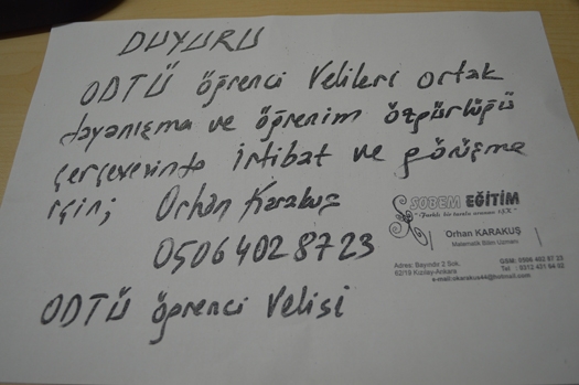 Başbakanı ODTÜ’den kovmak isteyen, ODTÜ’lü öğrencilere destek çığ gibi büyürken bir veliden de destek geldi. ODTÜ’de çocuğu okuyan veli, Orhan Karakuş destek çağrısı yaptı. Öğrenci velisi internet üzerinden ilan ettiği çağrı ile tüm öğrenci velilerini, çocuklarına, ODTÜ’lülere desteğe çağırdı. İrtibat için telefon numarasını da vermekten çekinmeyen öğrenci velisi öğrenim özgürlüğü çerçevesinde dayanışmak gerektiğini belirterek çağrı yaptı.
