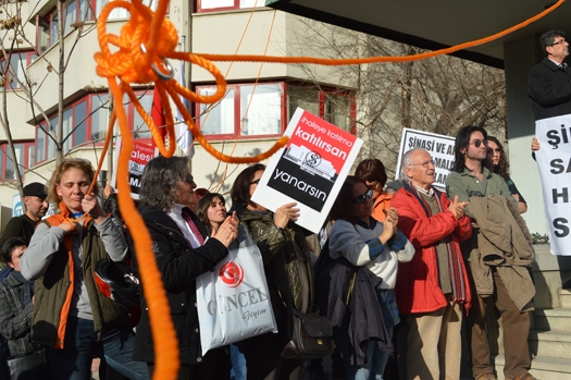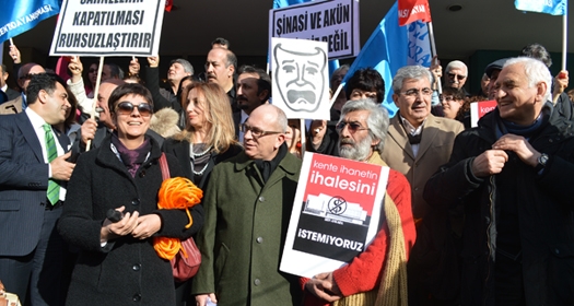 BaÅŸkent Dayanışması – Ben Ankara bileÅŸenleri Akün ve Åžinasi sahnelerinin satış ihalesinin olduÄŸu saatlerde Akün sahnesi önünde toplanarak ihaleyi protesto etti. “İhaleye Çomak Sokuyoruz” sloganı ile eyleme çaÄŸrı yapan gruba CHP Milletvekili Aylin Nazlı Aka ve Akün ve Åžinasi Sahneleri Halkındır Platformu’ da destek verdi. Akün Sahnesi önünde okunan basın açıklamasını BaÅŸkent Dayanışması adına Sanat Kurumu Genel Sekreteri Cemalettin Erol okudu. Açıklamada; “Ankara halkı; yeniden düzenlenecek bu mekân ile İnsan Hakları Evrensel Beyannamesi’nin 27,1 maddesinde yer alan “Herkes toplumun kültürel yaÅŸamına serbestçe katılma, güzel sanatlardan yararlanma, bilimsel geliÅŸmeye katılma ve bundan yararlanma hakkına sahiptir.” İlkesinin elinden alınmasına, kültürel ve sanatsal deÄŸerlerimizde mekânsızlaÅŸtırılmayla cezalandırılmaktadır. Ne yazık ki, Ankara’da planlamayla yapılan uygulamalar ile İmar Mevzuatı’ndan uzaklaşılmıştır. Daha açık bir anlatımla “mevzuat” tekrar yorumlanarak, farklı içerikte uygulanmaya baÅŸlanmıştır. Bir ulusun BaÅŸkent’in en temel iÅŸlevlerinden biri sinema ve tiyatrolardır. Sinema ve tiyatrolar artık alışveriÅŸ merkezlerinin içlerinde yer almaya baÅŸlamıştır. Bu anlayış kent merkezlerinin tüketim aracı haline getirmektedir. Sinema ve tiyatroların prestijli yapılar olması gerekirken, fastfood’lar ile birlikte sıradanlaÅŸtırmaktadır. Oysa sinema ve tiyatro yapıları tek başına sanatsal faaliyet veren yapılardır. Hiçbir planlama disiplininde yer almayan bir anlayışla AVM’ler içine hapsedilip, sıradanlaÅŸtırılmaktadırlar.” İfadelerine yer verildi.