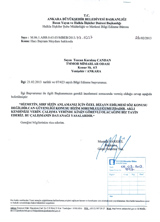 Candan, bilgi edinme kanununu hatırlatarak şöyle konuÅŸtu. “ilettiÄŸimiz yazı bilgi edinme kanununa dayanak yazılmıştır. İstediÄŸimiz bilgilerin hiçbiri gönderilmemiÅŸtir, itiraz hakkımızı kullanacağız.BüyükÅŸehir Beldiyesi kendi bildiÄŸini okuyan, insanların can güvenliÄŸini riske atan bir yaklaşımdadır. Hacıbayram ile ilgili hiçbir önlem alınmamıştır, suç duyurusunda bulunacağız. Her ne kadar üslupsuz da olsa Belediye BaÅŸkanı’dır ve İçiÅŸleri Bakanlığı’na baÄŸlıdır. Bu yazıyı İçiÅŸleri Bakanlığı’na gönderiyoruz. Bir Belediye BaÅŸkanı’nın Halkına karşı Kamu yararını savunan meslek odalarına, Ankara ‘da yaÅŸayanlara karşı nasıl bir davranışta bulunması gerektiÄŸini kendisine hatırlatmaları doÄŸrultusunda İçiÅŸleri Bakanlığı’na ÅŸikâyette bulunacağız. 8 Mart yaklaşırken bir kadın yönetici olarak kendisini ayrıca kınıyorum” ÅŸeklinde konuÅŸtu.