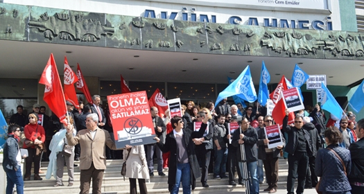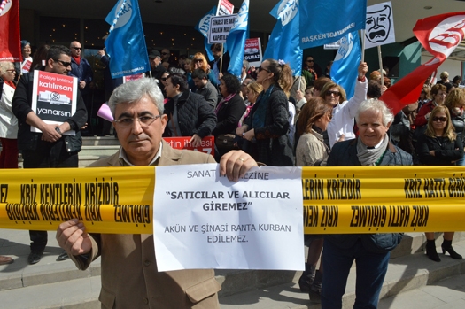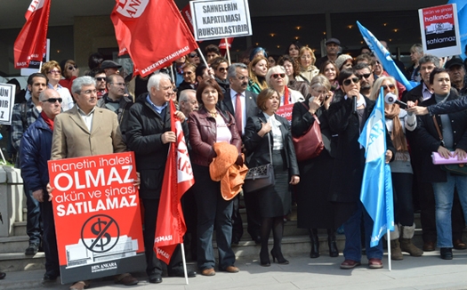 ALICILAR ve SATICILAR GİREMEZ Emek İnşaatın ihaleye çıkardığı Akün ve Şinasi Sahnelerinin satışı Başkent Dayanışması bileşenleri tarafından protesto edildi.