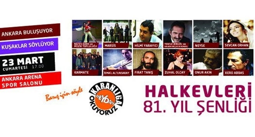 Halkevleri, kuruluşunun 81. yılını Ankara’da onbinlerle kutlamaya hazırlanıyor. Halkevlerinin “karanlığa Meydan Okuyoruz” Şenliği’ne ilişkin açıklamasını okurlarımızla paylaşıyoruz: Aydınlıkla karanlığın mücadelesi hiç durmadı. Emeğiyle geçinenlerin eşitlik, özgürlük, barış ve demokrasi özlemine karşılık emek sömürüsüyle geçinenler sömürüyü sürekli arttırdılar. Bugün emeğin, doğanın, kentlerin talanı ve karanlık bir rejimin yeniden inşası için atağa kalktılar. Eğitimin gericileştirilmesi, sağlığın tümden piyasalaştırılması, kentlerin ve doğanın talanı, kadınların köleleştirilmesi ve ülkemizin bitmez tükenmez bir savaşın içine sürüklenmesi gibi AKP uygulamaları bir an önce durdurulmalıdır. Bize dayatılan karanlığa meydan okumaya çağırıyoruz. Sen de bizimle ol. 23 Mart'ta Ankara Arena Spor Salonu'nda onbinler buluşuyor, bizi destekleyen sanatçılarımızla birlikte karanlığa meydan okuyoruz.