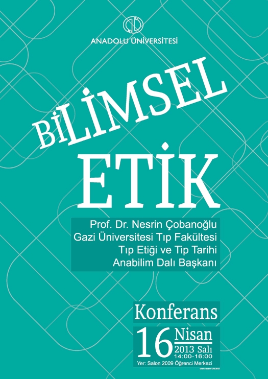 Üniversite öğrencileri “Bilimsel Etik” i tartışıyor. Gazi Universitesi Tıp Fakültesi Tıp Etiği ve Tıp Tarihi Anabilim Dalı Başkanı Prof. Dr. Nesrin COBANOGLU'nun katılacağı konferans Anadolu Üniversitesi’nde yapılacak. "Bilimsel Etik" başlıklı konferans 16 Nisan tarihinde Anadolu Üniversitesi Salon 2009 Öğrenci Merkezi’nde gerçekleştirilecek.