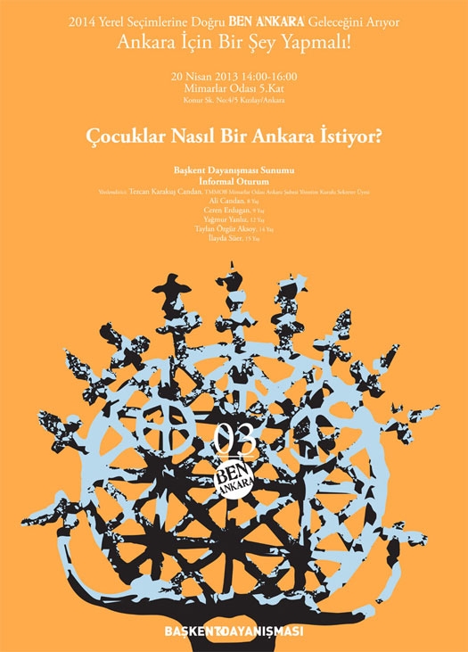 Başkent Dayanışması bileşenleri olarak bir araya gelen 42 örgüt, yerel seçim üzerine kurguladıkları çalışmalarını sürdürüyor. Yerel yönetim seçimlerine ilişkin Başkentlilerin beklentilerini kamuoyuyla paylaşmak üzere, ilkini “Akademisyenler Ankara’yı ve Yerel Demokrasiyi Tartışıyor”, ikincisini “Kadınlar Nasıl Bir Ankara İstiyor” başlıklarıyla gerçekleştiren Başkent Dayanışması üçüncü etkinliğini çocuklarla gerçekleştiriyor. 23 Nisan Ulusal Egemenlik ve Çocuk Bayramı Haftasında; farklı yaş gruplarından 5 çocuğun katılımıyla gerçekleştirilecek “Çocuklar Nasıl Bir Ankara İstiyor” söyleşisi 20 Nisan 2013 Cumartesi günü saat 14.00’da Mimarlar Odası Toplantı Salonu’nda. B A Ş K E N T D A Y A N I Ş M A S I