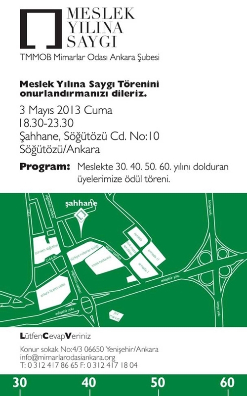 TMMOB Mimarlar Odası Ankara Åžubesi tarafından her yıl Meslek Yılına Saygı Töreni düzenleniyor. Bu yıl da Mimar Sinan Haftası etkinlikleri kapsamında düzenlenecek törende meslekte bir ömrü geride bırakan mimarlar bir araya gelecek. 30 yılını 40 yılını elli yılını ve 60 yılını mimarlık mesleÄŸinde geride bırakan mimarlar ödüllerini alacak. Åžahane Restaurant’ ta yapılacak olan Meslek Yılına Saygı Töreni 3 Mayıs tarihinde mimarları buluÅŸturacak.