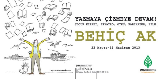 Karikatürist, çocuk kitapları ve oyun yazarı Behiç Ak, “Yazmaya Çizmeye Devam” başlıklı sergisi ile 22 Mayıs – 13 Haziran 2013 tarihleri arasında Ankaralılarla buluşuyor.