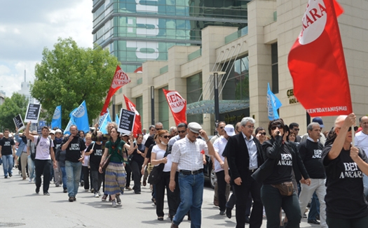 BaÅŸkent Dayanışması’ndan direniÅŸ çelengi BaÅŸkent Dayanışması, ABD KonsolosluÄŸu önüne siyah çelenk bıraktı ve AOÇ arazisine ABD elçilik binası yapmaktan vazgeçmesini talep etti. İstanbul’da Taksim Gezi Park’ının park olarak kalması için mücadele yürütülürken Ankara AOÇ mücadelesi veriyor. AOÇ’de baÅŸlayan yapılaÅŸmaya tepki gösteren bileÅŸenler bu kez AOÇ kaynaklı Çukurambar’daki araziye ABD BüyükelçiliÄŸi binası yapılacak olmasını protesto etti. Çukurambar’daki arazi üzerinde TOKİ’ ile ABD BüyükelçiliÄŸi arasında yapılan mutabakat tepki çekti. BaÅŸkent Dayanışması bileÅŸenleri bugün Mimarlar Odası önünde toplanarak, ABD konsolosluÄŸuna yürüdü. Atatürk Orman ÇiftliÄŸi’ndeki aÄŸaç kıyımına karşı mücadele eden Dayanışma bileÅŸenleri daha öncede AOÇ’de yapılmakta olan BaÅŸbakanlık Binası için farklı eylemlere imza atmışlardı. Yüzlerce kiÅŸi Konur Sokak’ta buluÅŸarak ABD konsolosluÄŸuna yürüdü. Yürüyüş sırasında çevredekiler alkışlarla, arabadakiler kornalarla protestoculara destek verdi. Mimarlar Odası Ankara Åžube BaÅŸkanı Ali Hakkan, CHP Milletvekili Levent Gök, Mülkiyeliler BirliÄŸi Genel Sekreteri Özgür Tüfekçi, KORDER temsilcisi Nevin Apaydın, Kavaklıderem DerneÄŸi BaÅŸkanı İsa ÇapanoÄŸlu, Ziraat Mühendisleri Odası BaÅŸkanı Turhan Tuncer ve Makine Mühendisleri Odası yöneticileri eyleme destek verenler arasında yer aldı. “ AKP yıkılsın aÄŸaç dikilsin” “ AOÇ’ye dokunma”, “Her yer Taksim Her yer DireniÅŸ” sloganları atarak konsolosluÄŸa yürüyen grubu, Kennedy Caddesi’nde polis durdurdu. Siyah çelengi BaÅŸkent Dayanışması bileÅŸenlerinin temsilcileri ABD KonsolosluÄŸu önüne bıraktı. Dayanışma bileÅŸenleri Kennedy Caddesi’nde bir basın açıklaması yaptı. Açıklamayı bileÅŸenler adına Mimarlar Odası Ankara Åžube Sekreter Üyesi Tezcan KarakuÅŸ Candan okudu. Açıklamada; “Atatürk Orman ÇiftliÄŸi AKP hükümetinde en büyük talanını yaşıyor… BaÅŸbakanlık Hizmet Binasının binlerce aÄŸaç kesilerek Atatürk Orman ÇiftliÄŸi arazisine yapılması ideolojiktir. AOÇ arazisine TBMM sosyal tesisin yapılması ideolojiktir. AOÇ arazilerinin parçalanarak tahsis edilmesi ve satılması ideolojiktir. Son olarak Çukurambar’da AOÇ arazisi iken Gazi Üniversitesine, oradan TOKİ’ye devredilen 6.400 metrekarelik arazinin ABD BüyükelçiliÄŸi’ne satılması konusunda mutabakat saÄŸlanmıştır. ABD’nin, kaynağı AOÇ olan topraklarda Büyükelçilik binası yapmasına, araziyi satın almasına asla izin vermeyeceÄŸiz. O topraklar bizim topraklarımız… ABD BüyükelçiliÄŸi diplomatik planlama alanına gitsin ve binasını yapsın… AOÇ topraklarından vazgeçsin… Atatürk Orman ÇiftliÄŸi bizim yaÅŸam alanımız, nefisimiz, mirasımız, geçmiÅŸimiz, geleceÄŸimiz. Atatürk Orman ÇiftliÄŸinin her karışına sahip çıkıyoruz. ABD BüyükelçiliÄŸini, AOÇ topraklarında gözü olduÄŸu için protesto ediyoruz. Siyah çelengimiz, öfkemizin sessiz tepkisidir, ABD BüyükelçiliÄŸini AOÇ topraklarından vazgeçtiÄŸini açıklamaya davet ediyoruz.” İfadelerine yer verildi. Candan ayrıca Taksim Dayanışması’na selam gönderdi: “ Taksim Gezi Parkında baÅŸlayan, Türkiye’nin her yanına yayılan ateÅŸ bizim yüreklerimizde yanıyor, sokaklarda özgürlüklerine, kararlara katılma hakkını savunanlara, yaÅŸamlarımıza, kentlerimize, çevrelerimize sahip çıkanlara kocaman selam gönderiyoruz. Sokaklar bu özgürlük ateÅŸini yakan gençlerle özgürleÅŸecek. Polisin ÅŸiddetine maruz kalan çocuklarımızın yanında olacağız, onlarla birlikte mücadele edeceÄŸiz” dedi. Siyah çelenk bıraktıktan sonra, sloganlar eÅŸliÄŸinde yürüyen topluluk, bir gün önce polisin bastığı Nazım Hikmet Kültür Merkezi’nde mola verdi. Mimarlar Odası Ankara Åžube BaÅŸkanı Ali Hakkan, polisin kullandığı orantısız gücü ve ÅŸiddeti kınayarak Kültür Merkezi’ndekilere geçmiÅŸ olsun dileklerini iletti. Toplam Görüntülenme : 106467 |