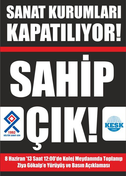 Paranız yoksa sanat da yapamayacaksınız. Kültür Sanat ve Turizm Emekçileri Sendikası Genel Merkezi, sanat alanlarının yağmalanmasına karşı sokağa çıkacağını duyurdu. Kültür Sanat Sendikası Genel Merkezi, bugün yaptığı açıklamayla Türkiye Sanat Kurumu ile Sanatın Desteklenmesi adı altında çıkarılmak istenen yasaya dikkat çekti. Yapılan açıklamada şu ifadelere yer verildi: “ Yıllardır devam eden kamunun tasfiyesi sürecine Kültür Sanat alanı da dâhil edilmiştir. Türkiye Sanat Kurumu ile Sanatın Desteklenmesi adı altında çıkarılması düşünülen yasa ile yetmiş yılı aşkın bilgi ve birikime sahip sanat kurumları tamamen yok edilmektedir. Yerine bürokratların ağırlıkta olduğu Türkiye Sanat Kurumu getirilmek istenmektedir. Yasa ile Devlet Tiyatroları, Devlet Opera Ve Balesi, Güzel Sanatlara Bağlı Koro Ve Topluluklar ile Senfoni Orkestraları lağvedilmekte ve tüm çalışanları Kültür Bakanlığına devredilerek İl Kültür ve Turizm Müdürlükleri emrine verilmektedir. Sanat kurumlarının taşınmazları, kostüm dekor vs. dâhil tüm mal varlığı Türkiye Sanat Kurumuna bırakılmaktadır. Kurulacak Türkiye Sanat Kurumu hali hazırda var olan ya da kendi bünyesinde kuracağı şirketler üzerinden proje bazında ve hizmet alım yöntemiyle sanatı alıp satacak. Yine kurumlarımızın yerini Destekleme Grup Başkanlığı adı altında oluşturulacak hizmet birimleri alacak. (tiyatro destekleme grup başkanlığı gibi) Yani yasa bu haliyle geçerse, yeni yapı icracı değil destekleyici olacak. Desteklenecek projelere tamamen kurul karar verecek ve kimseye hesap verme zorunluluğu olmayacak. Yapılacak destek projenin yüzde 50sini geçmeyecek.” Kültür Sanat-Sen çıkarılması düşünülen bu yasaya karşı direndiklerini ifade etti. Sanatçılar ve sanatseverler, 8 Haziran Cumartesi günü saat 12.00’da tüm iller ve sanatseverlerin katılımıyla; Kolej meydanında toplanıp Ziya Gökalp caddesine yürüyecek.