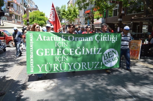 Başkent Dayanışmasın sekreteryasını yürüten Mimarlar Odası Ankara Şube Sekreter Üyesi Tezcan Karakuş Candan Başkent Dayanışması adına yaptığı açıklamada, “ Buraya bıraktığımız sarı çelenk ikaz etmek anlamına geliyor. ABD Büyükelçiliği’ni kaynağı AOÇ olan Çukurambar’da bulunan hülle yoluyla Gazi Üniversitesi’ne oradan da TOKİ’ye devredilen araziden vazgeçmeye davet ediyoruz. Atatürk Orman Çiftliğinin tahsislerle devredilen arazilerinin amacı dışında kullanımında olanların izlerini sürdüklerini ifade eden Candan ABD elini AOÇ arazisinden çekmeli, ABD’ye verilecek bir karış AOÇ toprağımız yok. ABD konsolosluğu’nu uyarıyoruz, kendimizi buraya zincirlemek durumunda bırakmasınlar. Sayımızın azlığına Tomaların çokluğuna bakmadan AOÇ için kendimizi siper ederiz “ şeklinde konuştu. Başkent Dayanışması adına yapılan açıklamadan sonra bileşenlerde söz alarak açıklama yaptı. Mimarlar Odası Ankara Şube Başkanı Ali Hakkan: Gözümüzün içine baka baka yalan söyleyerek, ABD arazisi üzerinde herhangi bir tasarruflarının olmadığını söylüyorlar. Oysa orası AOÇ kaynaklı arazidir, AOÇ arazisidir. Mimarlar Odası Ankara Şubesi olarak, ABD Büyükelçiliği’ne yazı yazdık, TOKİ ile mutabakata vardıkları arazinin eski AOÇ arazisi olduğunu belirttik. Parsel ve ada numarasına kadar yazımızda belirterek buraya elçilik binası yapmaktan vazgeçmelerini istedik. Eğer hala anlamadılarsa oranın bir AOÇ arazisi olduğunu bize randevu versinler gidip anlatalım” dedi.