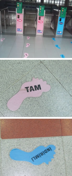 Anlaşılan bu yeterli olmamış. Son bir aydır bilet turnikelerini ayırdıklarını, tam bilet geçişlerini pembeye, indirimli bilet geçişlerini de maviye boyadıklarını gördük. Hatta pembe turnikelere giden pembe ayak izleri, mavi turnikelere giden mavi ayak izleri yapıştırmışlar.