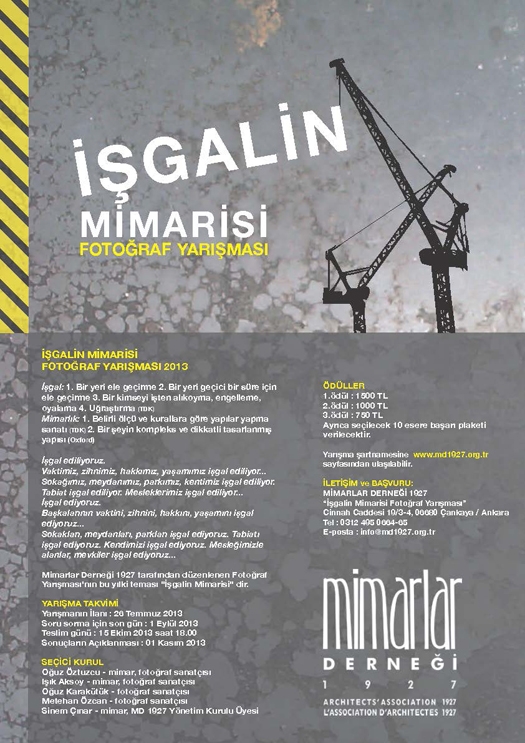İLETİŞİM ve BAÅžVURU: MİMARLAR DERNEĞİ 1927 “İşgalin Mimarisi FotoÄŸraf Yarışması” Cinnah Caddesi 19/3-4, 06680 Çankaya Ankara Tel : 0312 495 0664-65 E-posta : info@md1927.org.tr