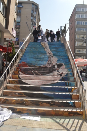 Kabahatlar Atölyesi, Konur Sokaktaki üst geçidin merdivenlerine resim yaparak Mimarlık Haftası’na selam gönderdi ve Mimarlar Odası Ankara Åžubesi’ne mesaj iletti. Kabahatlar Atölyesi Mimarlık Haftası’na gemili selam gönderdi. Mimarlar Odası Ankara Åžubesi Dünya Mimarlık günü ile baÅŸlayan Mimarlık Haftası etkinliklerinin temasını direniÅŸ, mekan, kültür olarak belirledi. Mimarlık haftası için selam gönderen Kabahatler Atölyesi ekibi Konur Sokak’ta bulunan üst geçit merdivenlerine mavilikler içinde bir gemi resmi yaptı. Resmin üstünü beyaz kağıtlarla kapatan atölye resmin açılışını yapmayı Mimarlar Odası Ankara Åžube yöneticilerine bıraktı. Daha önce de aynı ekip, aynı yere 23 Nisan’da Erdal Eren’in, Haziran direniÅŸi sırasında da Ethem Sarısülük’ün resmini yapmıştı. Deniz’de bir yelkenli resmi yapan atölye Mimarlar Odası Ankara Åžubesi’ne bir de mesaj iletti. Mesajı Mimarlar Odası Ankara Åžube BaÅŸkanı Ali Hakkan okudu. Mesajda; “ Kabahatler atölyesi hepinizi selamlar, Atölyemiz sokaktadır, hayattadır. Akan CaÄŸ’ın da, duran coÄŸrafyanın da farkındayız. Hayallerimiz var, gerçekçiyiz. Umutlu ve sorumluyuz. Ülkemiz yakın zamanda büyük deÄŸiÅŸiklikler geçirmiÅŸtir. Hepinizi bu vesile ile hayatın tarafına, kazanımlara sahip çıkmaya davet ediyoruz. Eylemlerimiz yeryüzü aÅŸkın yüzü oluncaya dek.” İfadelerine yer verildi. Mimarlar Odası Ankara Åžube Genel Sekreteri Tezcan KarakuÅŸ Candan resimle ilgili olarak şöyle konuÅŸtu. “ deniz kenarında yelkenleri henüz açılmamış bir gemi var, derinliÄŸe ve hayata açacak yelkenlerini. Sanat sokakları özgürleÅŸtiriyor, sokakları özgürleÅŸtirdikleri için Kabahatler atölyesine teÅŸekkür ederiz.” Hakkan gemi için mavilik ve deniz özgürlüktür özgürlüğe gidecek bir gemi ile selam göndermiÅŸler, O geminin de her kesimi kucaklayan Mimarlar Odası olduÄŸunu düşünüyorum yorumunu yaptı. Toplam Görüntülenme : 102241 |