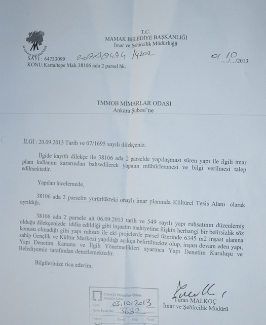 TMMOB Mimarlar Odası Ankara Şubesi tarafından gönderilen yazı aşağıdadır. MAMAK BELEDİYE BAŞKANLIĞI ANKARA