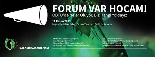 BaÅŸkent Dayanışması bileÅŸenleri “Forum Var Hocam: ODTÜ’de Neler Oluyor, Biz Hangi Yoldayız” adı altında tartışmalı ODTÜ yolunu masaya yatırıyor. Moderatörlüğünü Pınar EcevitoÄŸlu’nun yapacağı etkinlik İnÅŸaat Mühendisleri Odası Teoman Öztürk Salonu Konferans Salonu’nda gerçekleÅŸtirilecek. 11 Kasım saat: 18.30’da yapılacak etkinlikte mimar, plancı ve ulaşım uzmanı Erhan Öncü ‘nün gerçekleÅŸtireceÄŸi genel sunumun ardından forum baÅŸlayacak. Forum katılımcıları arasında, Himmet Åžahin, ODTÜ Mezunlar DerneÄŸi; Ali Gökmen ODTÜ Öğretim Elemanları DerneÄŸi;  Deniz Erdem, ODTÜ Asistan Dayanışması EÄŸitim-Sen 5 Nolu Åžube; Arda Aral, ODTÜ Makine MühendisliÄŸi Öğrencisi; Hadi İskit, 100.Yıl İnisiyatifi; Elvan Altan Ergut, TMMOB Mimarlar Odası Ankara Åžubesi  Yönetim Kurulu Üyesi yer alıyor.