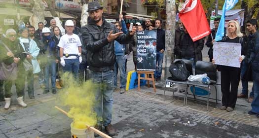 Biber gazına tatbikat BaÅŸkent Dayanışması bugün ilginç bir eyleme imza atarak biber gazını protesto etmek amacıyla gaz tatbikatı yaptı. BaÅŸkent Dayanışması BileÅŸenleri Yüksel Caddesi’nde biber gazı protestosu yaptı. Gaz tatbikatı var diye eylem çaÄŸrısı yapan bileÅŸenler biber gazına maruz kaldıklarında kentlilerin ne yapması gerektiÄŸini esprili bir dille anlattı. BileÅŸenler tatbikat sırasında, solüsyon , limon, gaz maskesi ve kaskları kullandı. Anons ve sirenlerin kullanıldığı eylemde yapılan anons eÅŸliÄŸinde hareketlerle bileÅŸen üyeleri biber gazından korunmayı anlattı. Yapılan anonsta “ Ankara’da sokaÄŸa çıkarken mutlaka sırt çantanızı hazırlayın, çantanızda, gazdan korunmak için Talcid solüsyon, kesilmiÅŸ limon, gaz maskesi ve yaralanmamak için kaskınızı bulundurun. Polisin maske takmasından, kasklarının numarasını kapatmasından saldırıya geçeceÄŸini anlayabilirsiniz. Temiz hava sahasından çıkıp tehlikeli gaz sahasına girdiÄŸinizde, çantanızdan kasklarınız çıkarın önce kendi kaskınızı sonra çocuÄŸunuzu kaskını takın maskeleriniz takın. Panik yapmayın, yaralananları, ilk yardım merkezlerine taşıyın, kaçmayın eldiven yardımıyla gazı alın ve su dolu kovaya daldırarak söndürünüz” ÅŸeklinde ifadeler kullanıldı. BileÅŸenlerin eylem sırasında sis bombalarıda kullandı. “Gaz tabancasının heykelini yaptılar” BaÅŸkent Dayanışması BileÅŸenlerinden olan Yaygara Güncel sanat inisiyatifinden HeykeltıraÅŸ Erdal Duman, demirden polisin kullandığı biber gazı tabancasının 1/1 boyutunu tatbikatta kullanılmak üzere heykelini yaptı. Duman’ın yaptığı tabancayı polis kılığında BaÅŸkent Dayanışması bileÅŸenlerinden Kavaklıderem derneÄŸi temsilcisi İsa ÇapanoÄŸlu kullandı. ÇapanoÄŸlu cebindeki gaz fiÅŸeklerini yerlere atarken sis bombaları aynı anda etrafı dumana boÄŸdu. BaÅŸkent Dayanışması’nın gaz tatbikatı çevredekiler tarafından iligyle izlendi. Tatbikattan sonra yapılan basın açıklamasını BaÅŸkent Dayanışması adına Çevre Mühendisleri Odası Ankara Åžubesi’nden Cem Åžahin okudu. Açıklamada, “YaÅŸamımız hükümetin uyguladığı gaz politikaları ile tehdit altındadır. Yürüdüğümüz sokaklarda, hastanede, pastanede, çocuk parklarında, meydanlarda, adliye koridorlarında, apartman boÅŸluklarında, metroda gaza maruz kalmanız içten bile deÄŸil. Halkına zehirli gaz sıkan bir hükümetle karşı karşıyız. Kullanılan gazların tamamı kimyasal silahlar sınıfındadır. Meslek odaları tarafından kullanılan bu gazların Güvenlik Bilgi Formu (GBF) bilgilerini yetkili makamlardan istenmiÅŸ olduÄŸu halde hala tatmin edici bir açıklama yapılmamıştır” denildi. Barışçıl gösterilerde bile sürekli göstericilere gaz atıldığına dikkat çekilen açıklamada: “Güvenlik kuvvetleri tarafından kullanılan bu gazlar, 1993 yılında imzalanan Kimyasal silahlar konvansiyonuna göre göz yaÅŸartıcı gazlar sınıflandırmasına girmekte ve "kimyasal silah" olarak nitelendirilmektedir. SözleÅŸme uyarınca toplumsal olaylarda, kitlenin kontrolü amacıyla kullanılan biber gazı dahil olmak üzere kimyasal gazları silah olarak kullanmak kesinlikle yasaktır. YaÅŸamın her alanında attığınız, içerisinde kimyasal olan gazın etkileri doÄŸada parçalanarak sürmektedir. Havaya suya ve topraÄŸa yayılmaktadır. Sizin çocuklarınız, aileleriniz de attığınız gazlı havayı solumakta unutmayınız. Åžimdi maskelerinizi çıkartınız, ve gerçek yüzünüzü aynada görünüz. Çocuklarınız ve halkınızı öldürmeye zehirlemeye devam edecek misiniz? BaÅŸkent Dayanışması olarak kentlerde saÄŸlıkla ve insan yaÅŸam hakkını savunmaya devam edeceÄŸiz.” İfadelerine yer verildi. BAÅŸkent DAyanışması 5 aralıkta maskeli yaÅŸam günü ilan ederek herkesi yerli yersiz atılan gaza karşı maske giymeye davet etti. Aynı gün Dünya SAÄŸlık ögütü Türkiye temsilciliÄŸi önünde eylem gerçekleÅŸtİrecek olan BAÅŸkent dayanışması, dünya saÄŸlık örgütüne ÅŸikayet edecek... Toplam Görüntülenme : 87214 |
